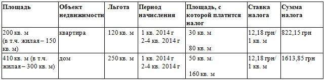 Итак, за отчетный 2014 год налог на недвижимость платится в течение 2015 года по действовавшим в минувшем году ставкам и механизму. То есть, для квартир площадью 240 кв. м, и домов площадью не более 500 кв. м ставка составляет 1% размера МЗП (установленной на 1 января отчетного года) за 1 кв. м (12,18 грн).