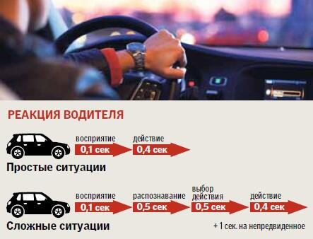 Участники аварий впоследствии обычно сетуют на то, что им не хватило малости — лишней секунды для маневра или лишнего метра до препятствия, что в конечном счете сводится к той же нехватке времени на торможение. В простых и сложных ситуациях алгоритм действий человека разный. В первом случае он оценивает ситуацию и действует немедленно (на все ему нужно до полусекунды), во втором — ему нужно дополнительное время на выработку решения (и тогда период реагирования увеличивается втрое).