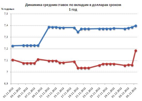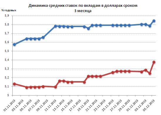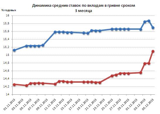 К слову, среди гривневых вкладов наибольшим ростом отметились депозиты с правом частичного снятия средств (универсальные) – средняя ставка по ним при сроке три месяца выросла с 7,9% до 8,5% годовых, при сроке один год - с 8,6% до 9,1% годовых. При этом основной рост пришелся на первые даты декабря-2013.