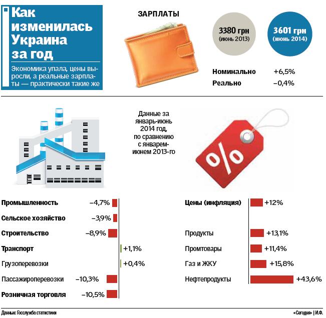 ЗАРПЛАТЫ . Впервые за последние 5,5 года снизились реальные (с учетом роста цен) зарплаты, пусть и немного, на 0,4%. По словам руководителя отдела аналитики Forex club Николая Ивченко , последний раз такое было в кризисном 2009 году. «Уровень жизни народа упал по таким причинам: продолжение экономического спада как в Европе, так и в Украине, усугубленное войной на Востоке, повышение тарифов на газ и коммуналку по требованию МВФ, 50%-ная по сравнению с июнем 2013 г. девальвация гривни и замораживание зарплат бюджетникам и пенсий, — говорит Ивченко. — В этом году можем ожидать лишь, что падение доходов населения остановится, а его роста не будет».