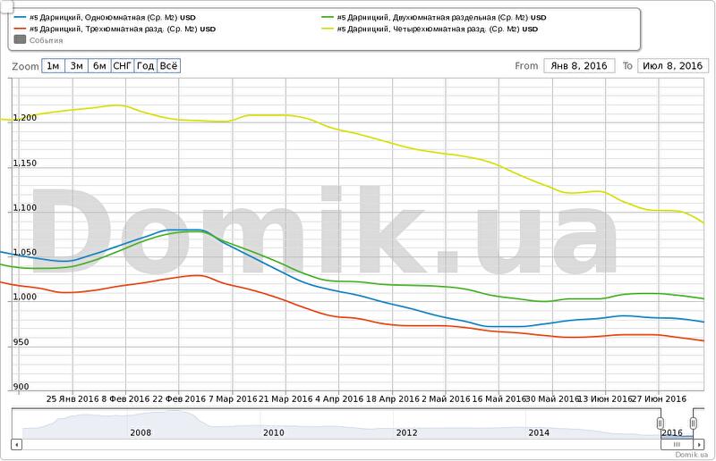 С начала года стоимость квадратного метра квартир на вторичном рынке в Дарницком районе снизилась на 5,4% - с $1060 по данным на 8 января 2016 года до $1003 на 8 июля 2016 года (в Деснянском - на 5,1%, в Днепровском - на 6,2%). В среднем на вторичном рынке квартир Киева за тот же период стоимость квадратного метра квартир упала на 7,8%.