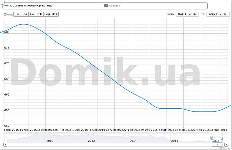 По данным портала, средние цены предложений продажи квартир в Днепропетровске в долларах США снизилась на 3,5%, с $681 до $657/кв. м. Как видно на графике, снижение средних цен было зафиксировано в период с начала января до начала марта 2016 года.