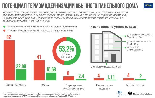 Затраты на термомодернизацию типичной кваритры в многокварирном доме площадью 50 кв. м. могут составлять от 1,5 до 5 тыс. евро в зависимости от комплексности мероприятий. Однако, в результате проведенных мер, по подсчетам аналитиков Информационной кампании Stronger Together!, экономия на отоплении может составит около 50% (сейчас средний чек на отопление составляет 460 грн, а может сократиться до 245 грн) ежемесячно при текущей цене на газ.