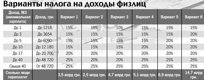 В правительственной концепции реформирования налоговой системы предлагаются шесть вариантов изменения налога на доходы физлиц. Все они предполагают дифференцированную шкалу налогообложения (см. таблицу). При этом все 6 вариантов предполагают увеличение поступлений в бюджет.