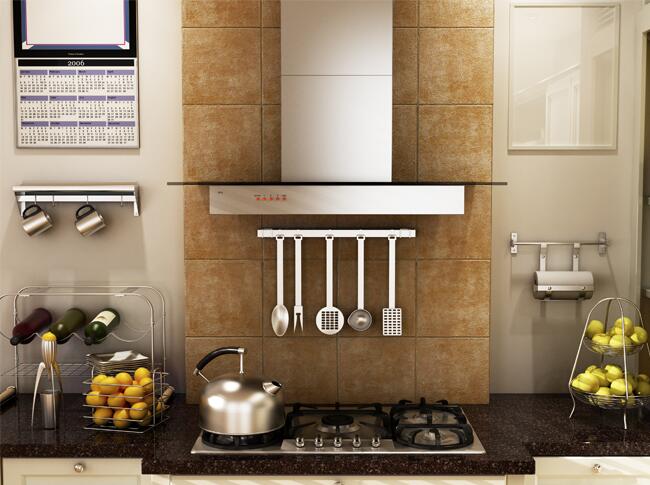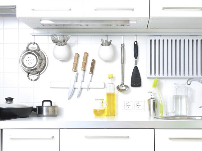 Изменить кухонный «фартук» может помочь рейлинг. В таком случае на него нужно подвесить не только нужные на кухне «технические» предметы, но выбрать из них самые декоративные: яркие кружки, подставки под горячее, столовые приборы с расписными ручками, горшочки с пряными травами. Помимо рейлинга, на некоторых плитках можно разместить отдельные самоклеящиеся крючки и также подвесить красивые аксессуары.