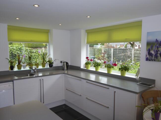 На кухне лучше использовать короткие рулонные шторы.