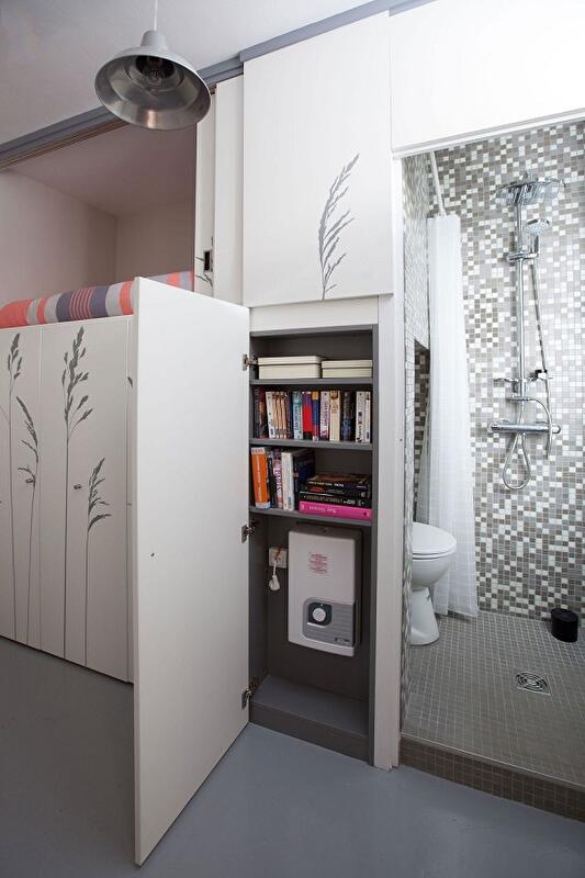 В результате в этом лаконичном интерьере эстетика минимализма удачно сочетается с удобством и функциональностью. Тут есть спальное место, небольшая кухня, душевая, спрятанный за панелями шкаф, стол и книжный шкаф.