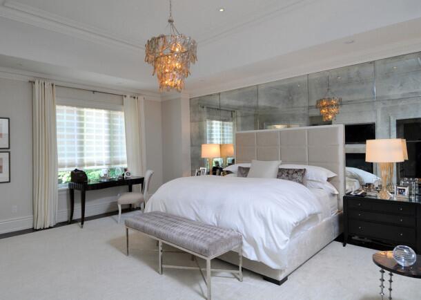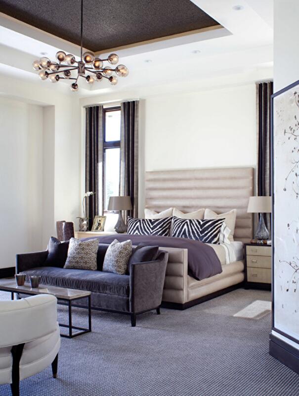 Люстра должна быть большой и массивной. Также возможно расположение точек вдоль коротких стен. Кроме того, используйте торшеры, настольные лампы — они располагаются на разных высотах и правильно подчеркнут все выгодные стороны вашей спальни.