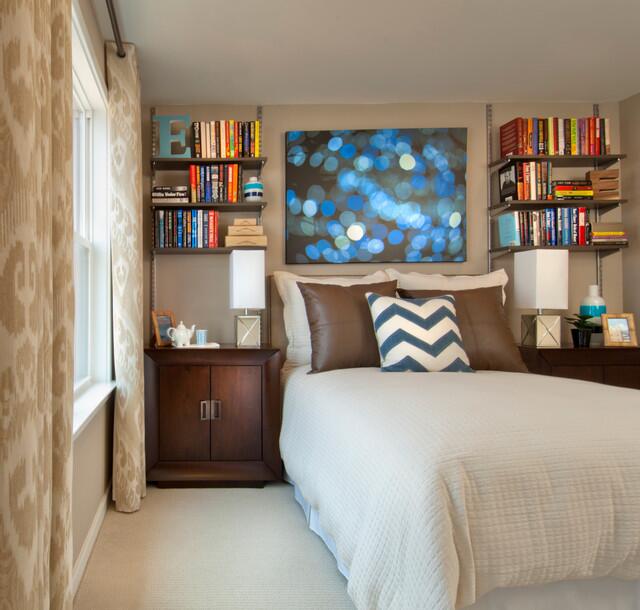 Мебель, расположенную вдоль длинных стен , напротив, можно заказывать эргономичную, но чуть меньше положенного стандартна или просто максимально узкую, сохраняя при этом и так неширокие проходы. Так, к примеру, над кроватью вдоль стены можно повесить узкую полку, которая заменит прикроватную тумбы и сохранит драгоценные 45см ширины комнаты.