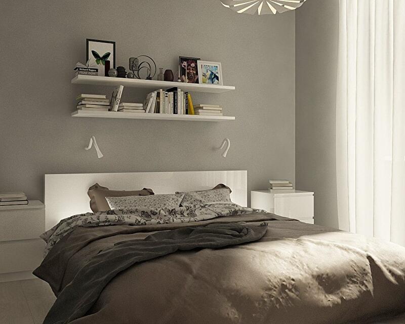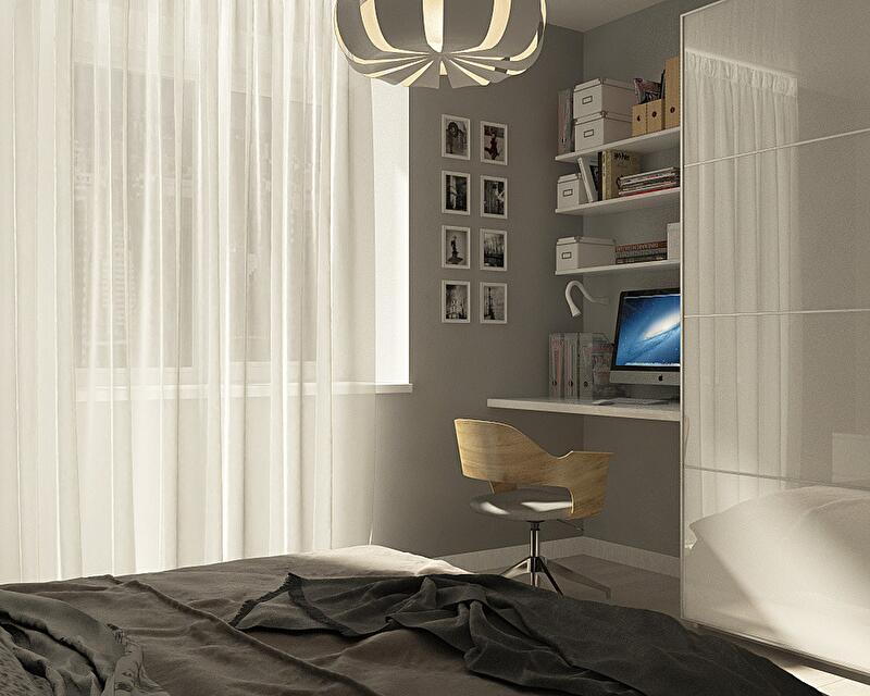 В этом интерьере предусмотрено 3 основных зоны для хранения вещей – высокий встроенный шкаф в прихожей от пола до потолка, шкаф-купе в спальне и небольшие закрытые системы хранения в гостиной. Над рабочим местом в спальне появились полки для размещения книг, декоративных ящиков и документов.