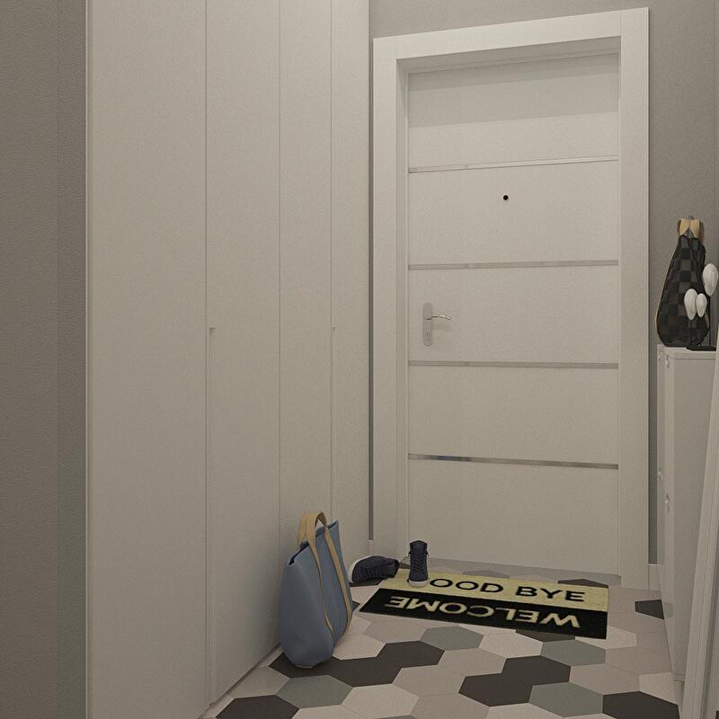 В качестве материала отделки пола жилых зон и коридора мы выбрали ламинат из-за его невысокой стоимости. Напольная плитка в прихожей и вдоль рабочей зоны кухни в виде правильных шестиугольников 3 разных оттенков серого, выложенная в произвольном порядке, служит особой визитной карточкой этого проекта.
