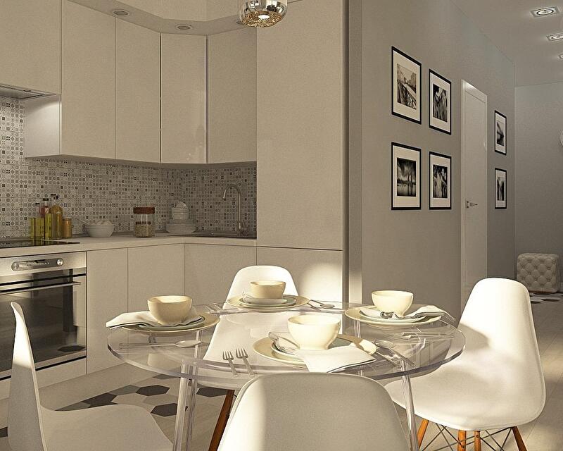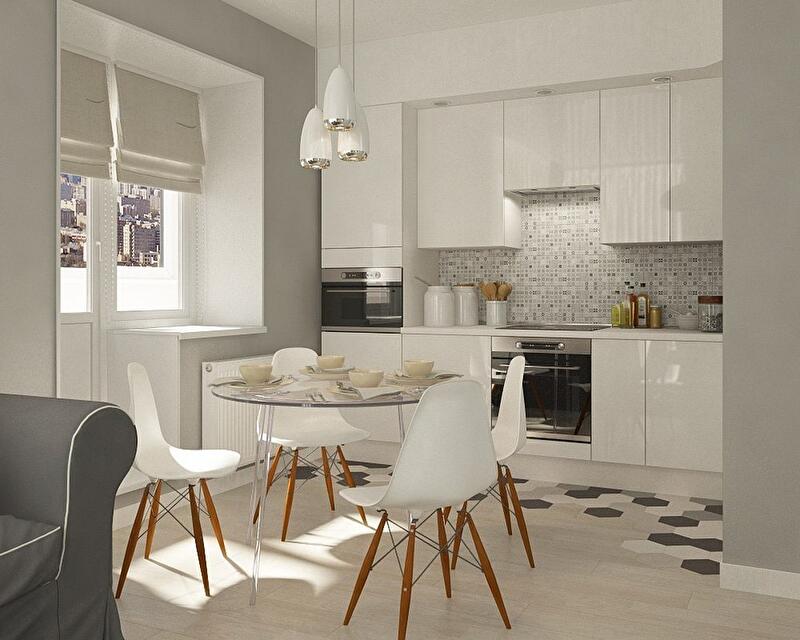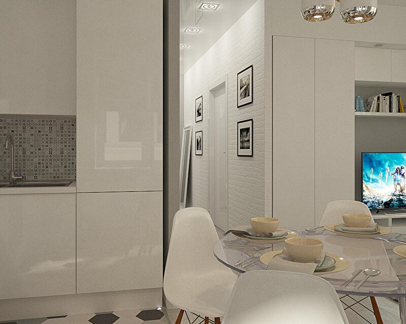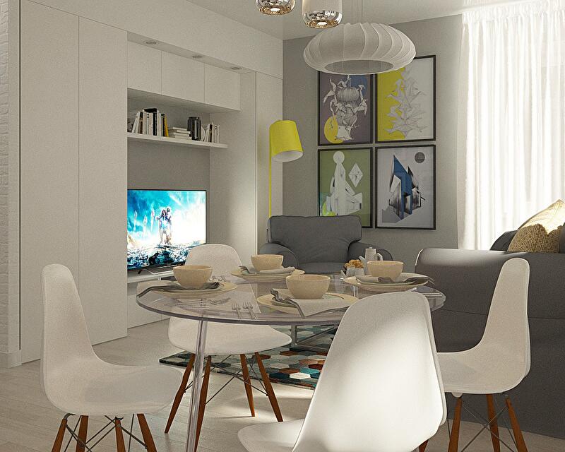 Все помещения этой квартиры помимо кухни-гостиной имеют совсем небольшие площади, поэтому серо-белая цветовая схема была выбрана неслучайно. Как известно, серый цвет отлично сочетает на своем фоне абсолютно любые цвета и оттенки и даже предметы из разных стилей и эпох, именно поэтому наши хозяева могут смело экспериментировать, добавляя в этот интерьер яркие детали и необычные предметы декора.