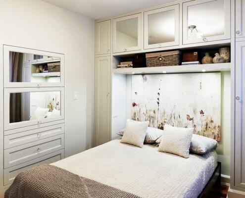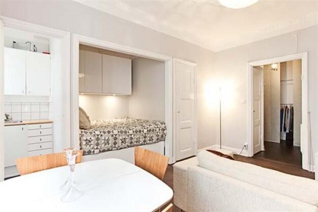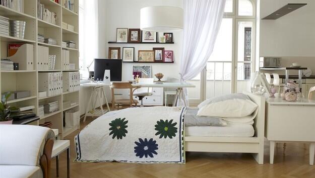 Система хранения в однокомнатной квартире должна быть продумана до мелочей. Малейший беспорядок и все очарование и уют бесследно исчезнут. Можно использовать мебель для зонирования пространства, установив гардероб между спальней и гостиной. Уместно использовать свободное пространство вокруг кровати и окна. Встроенные шкафы визуально менее заметны и очень удобны. Если вы используете подиум, то в его основании также можно расположить ящики для хранения.