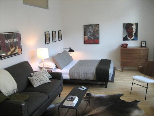 Более раскрепощенный выбор – единое пространство. В этом случае зона кровати отделена, как правило, чисто символически – невысоким стеллажом, цветным ковром или картиной на стене. Такой интерьер логично оформить в едином стиле. Цветовая гамма никак не выделяет зоны в комнате, только декор и мебель намекают на схематичное разделение приватной и гостевой зон. Эклектика в таком интерьере уместна, но в рамках единого стиля. Например, если ваш выбор современная классика, то разбавить лаконичный интерьер можно современным искусством. Стиль лофт прекрасно «играет» с классической брутальной мебелью. С помощью аксессуаров и правильно подобранной фурнитуры вы можете элегантно подчеркнуть зону отдыха, сна и даже разместить небольшую столовую в рамках гостиной.