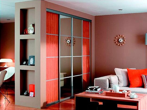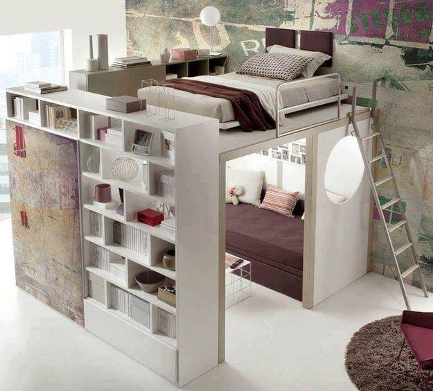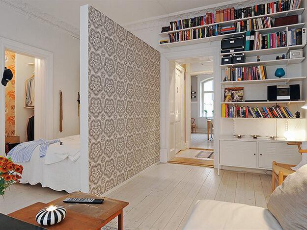 Вариантов реализации может быть несколько. Во-первых – традиционный «альков» – ниша в стене. Во-вторых – использование перегородок: ширмы, стеллажи, шкафы и даже дополнительно возведенная стена – идеальные варианты зонирования пространства. В-третьих – подиум: он также может быть скрыт нишей, мебелью или стенами.