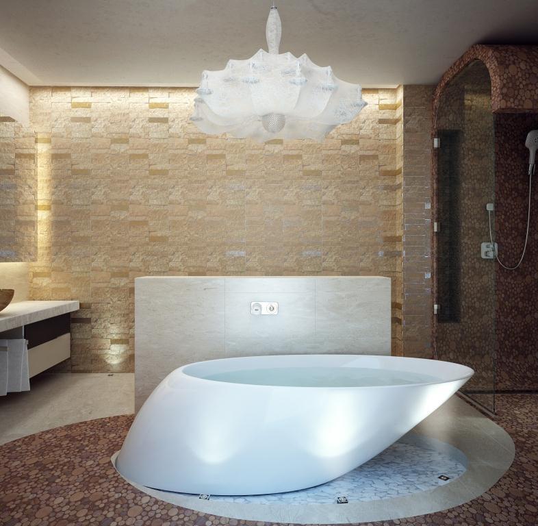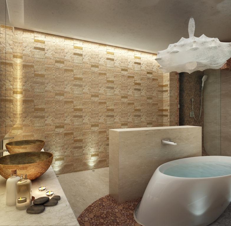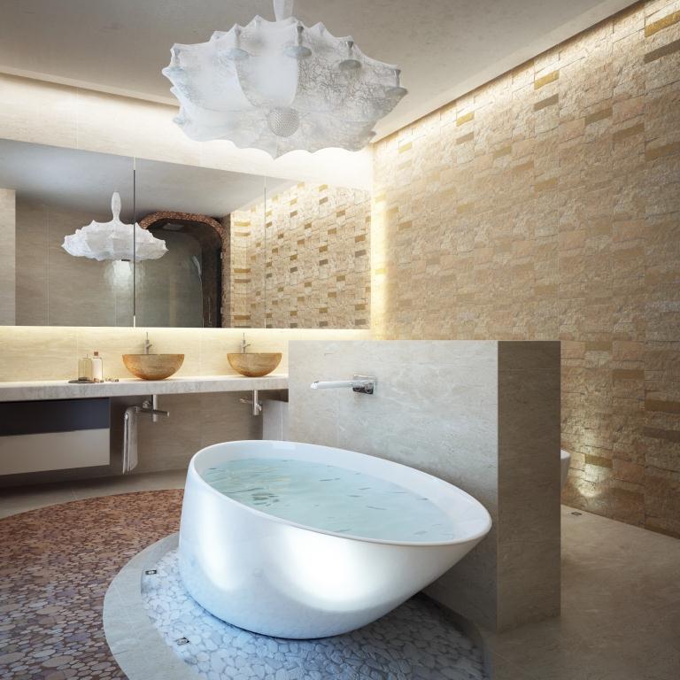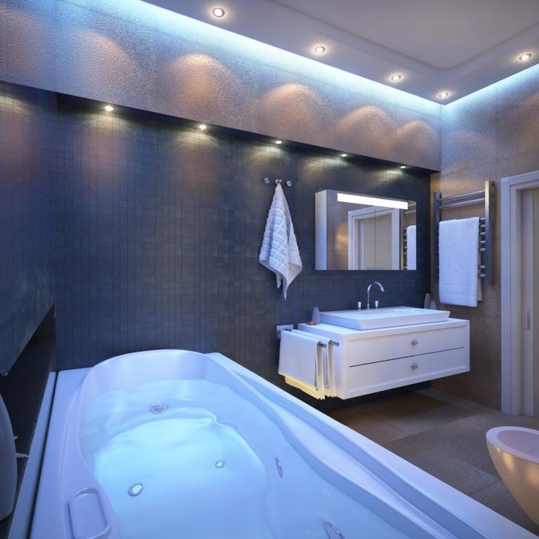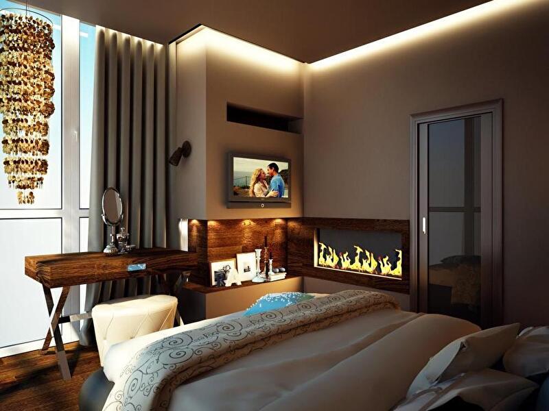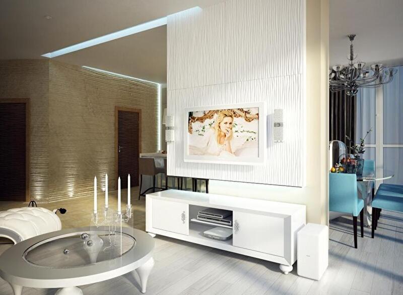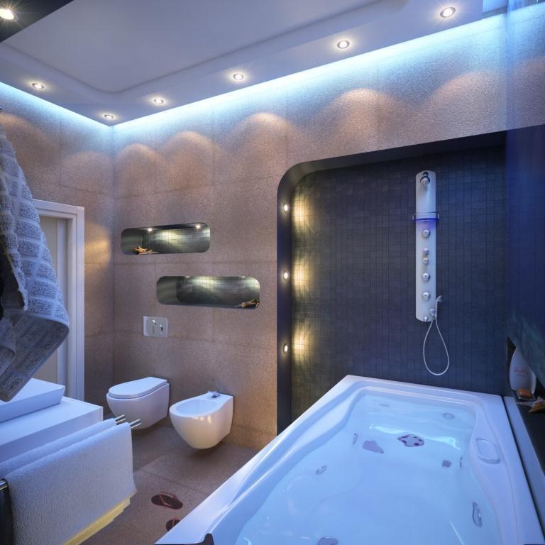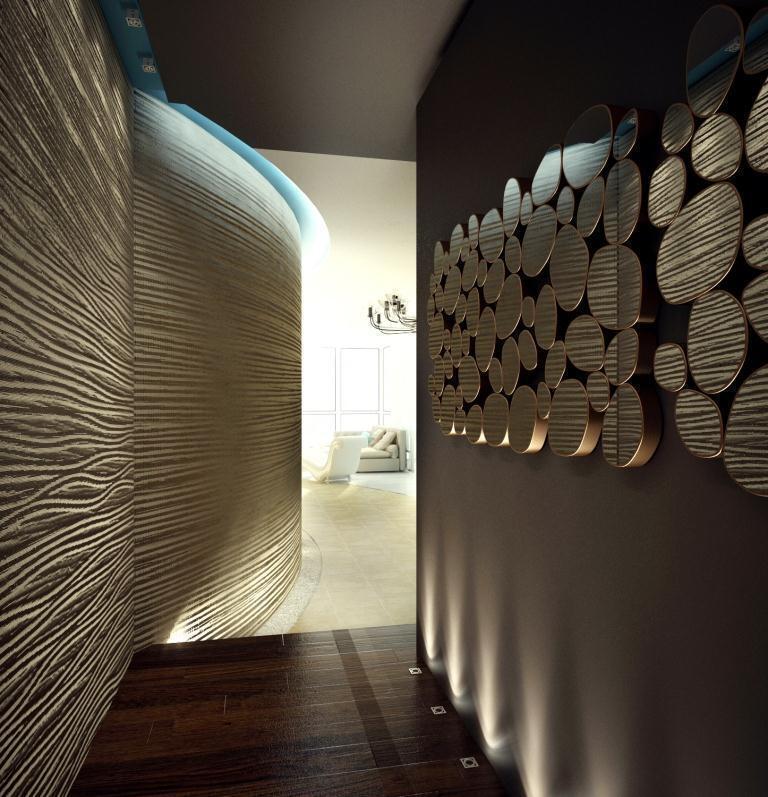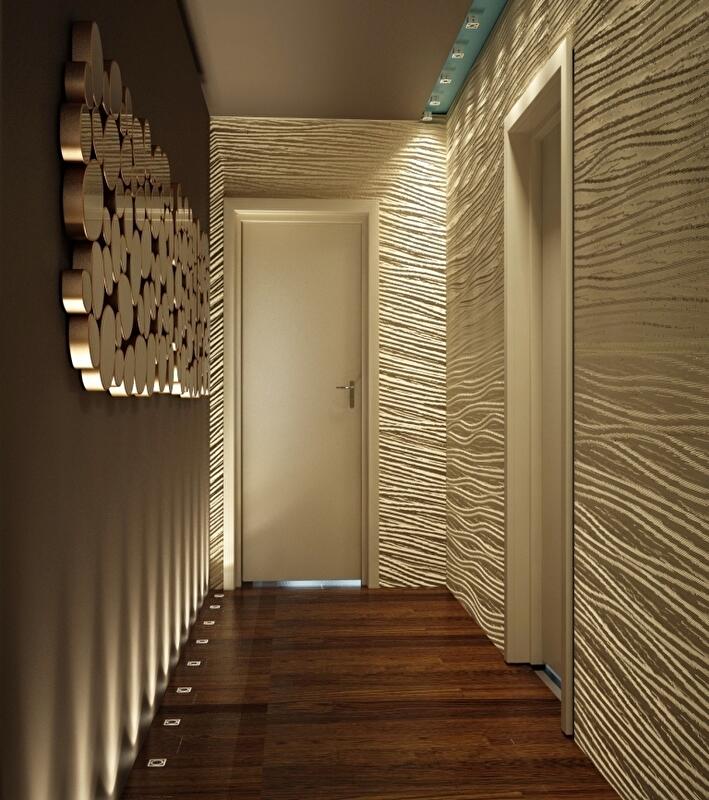 В интерьере есть несколько сценариев освещения: помимо центрального света используется встроенные точечный свет, светодиоды в нишах, которые по вечерам отвечают за уютную, теплую атмосферу.
