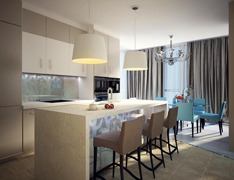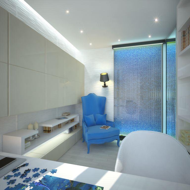 Что касается цвета, то изначально заказчики мечтали о квартире, оформленной в морском стиле. Мы были против прямых ассоциаций (якоря, штурвалы), поэтому обыграли морскую тему легкими намеками: нежные оттенки молочно-белого и песочного наполняют помещение уютом и теплом, а яркие лазурные оттенки добавляют нотку свежести и морского бриза.