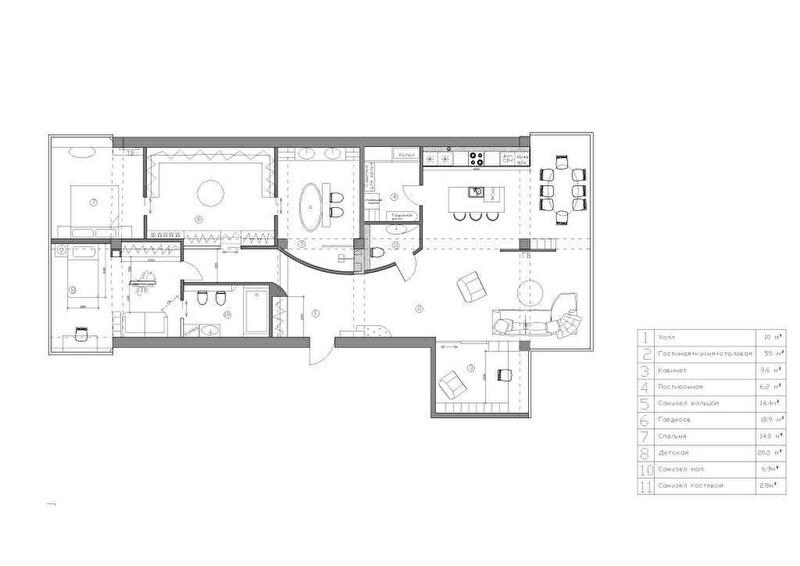Изначально квартира была свободной планировки и представляла собой вытянутый прямоугольник – огромное поле для воплощения дизайнерских идей. Мы предложили разделить пространство на две части – общественную и приватную зоны. Кухню, столовую и гостиную объединили, рядом обустроили гостевой санузел и постирочную. А на другой половине квартиры мы обустроили личные апартаменты родителей и детскую с сопутствующими служебными помещениями. В результате нам удалось сделать все комнаты широкими, близкими по форме к квадрату, и избежать наличия многочисленных коридоров.