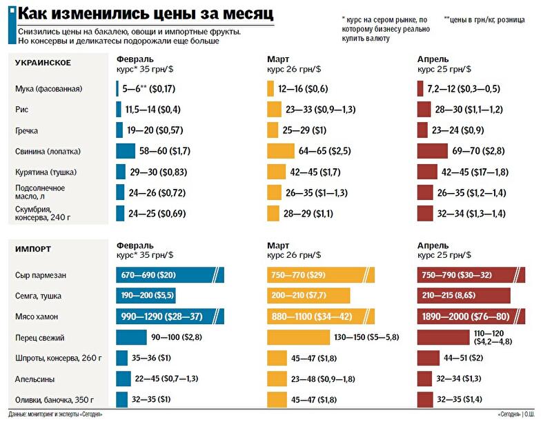 "Прежде всего улеглась паника. Поэтому поставщики бакалеи, цены на которую выросли больше всего, снизили оптовые цены. Соответственно, подешевела и розница, — говорит Молчанов. — Не снижают цены только маслобойщики, но мы нашли выход: продаем подсолнечное масло от небрендовых производителей, расфасованное в бутылки по нашему заказу. Оно дешевле на 5—9 грн, так что у покупателя появляется выбор. С импортом же ситуация следующая: скоропортящиеся продукты — свежие овощи, апельсины, рыбу, морепродукты — уже завозим по курсу доллара, который на 10—15 грн дешевле, чем месяц-два назад. Это сразу снизило цену. А вот то, что хранится долго, прежде всего выдержанные сыры, деликатесные мясопродукты, были закуплены, еще когда доллар стоил 35 грн и больше, и их покупают мало. Новые партии должны быть уже дешевле, но в них заложен новый налог на импорт, введенный правительством — 10% от стоимости".