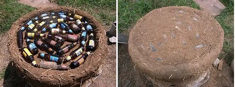 Изолирующий слой для пивных бутылок был замешан на глиняном растворе и опилках. На него мы аккуратно положили 17 огнеупорных кирпичей уже на песчаный раствор.