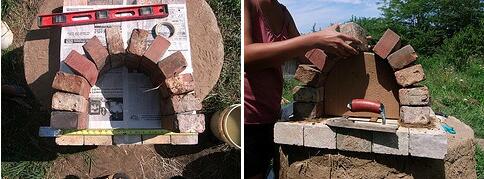 Перед сборкой самого купола печки, мы сделали арочный проем с мелиорированного красного кирпича, и связующей глиняно-песчаной смеси.