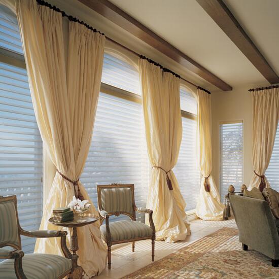Бежевые и кремовые шторы позволяют сделать интерьер утонченным и спокойным.
