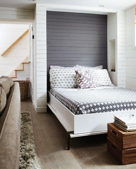 Кровать, расположенная посреди комнаты визуально смотрится неуместной и слишком громоздкой, а с практической стороны забирает очень много свободного пространства, что в реалиях современных квартир, можно сказать, непростительно.
