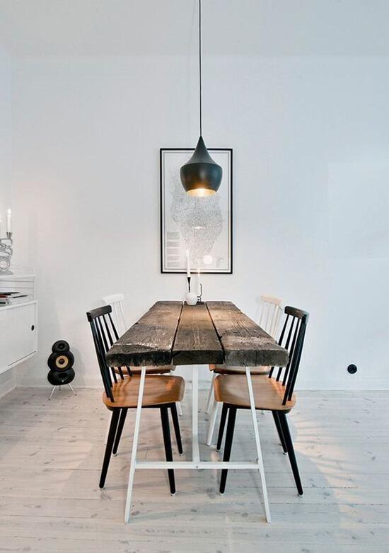 В отличие от предыдущего варианта, этот подходит практически для любых кухонь, даже самых узких. Впрочем, даже в большой кухне такое дизайнерское решение будет вполне уместным, тем более, что стол можно расположить не только длинной стороной к стене, но и торцом, на манер барной стойки. Стол-консоль может позволить вам сэкономить много места, но вам придется смириться, что одна из стен кухни останется незадействованной: над столом не повесишь шкафчики. Приставляя стол к стене, позаботьтесь о хорошем освещении над ним.