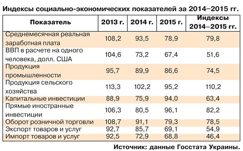 За два кризисных года (2014—2015) объем экспорта товаров и услуг снизился на 45,1%, импорта — на 53,6 (см. табл.). Столь резкое падение экспорта привело к девальвации гривни и повсеместному снижению уровня жизни. Мы в Европу практически ничего не можем поставлять, кроме сырья (черных металлов, руды, зерна и другой сырьевой аграрной продукции), мировые цены на которое в последнее время падают.