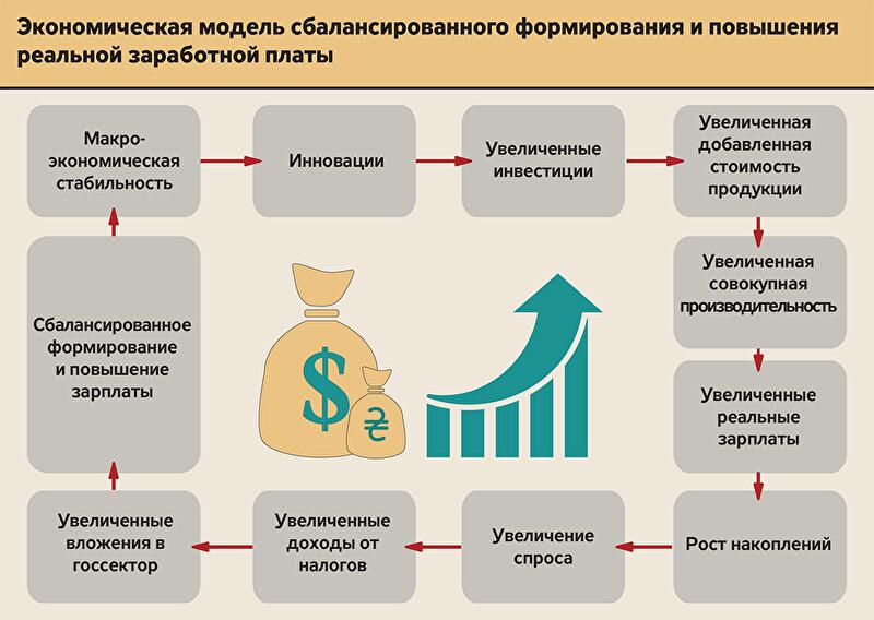Можно предположить, что сбалансированное формирование и повышение реальной зарплаты положительно повлияют на макроэкономическую стабильность, способствуя увеличению прибыли, инвестиций, добавленной стоимости и совокупной производительности. Все это будет способствовать росту реальных зарплат, доходов от налогов и вложений в госсектор, что, в свою очередь, позволит осуществлять сбалансированное формирование более высокой зарплаты и, в конечном итоге, эффективное управление трудовым потенциалом и производством.