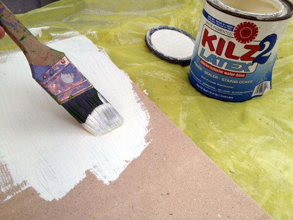 Прочно зафиксировав малярную ленту, а поверх нее наносим кисточкой или спреем белую краску, делаем это очень аккуратно, чтобы лента не загнулась от резких движений.