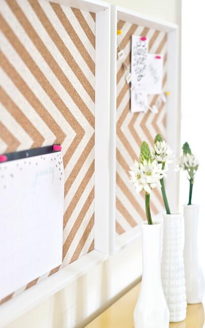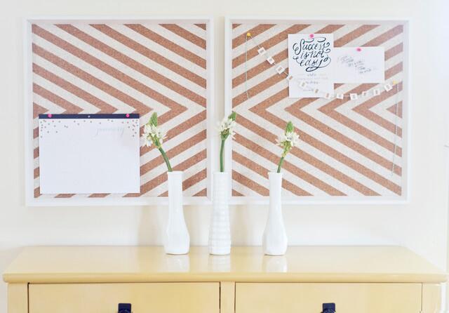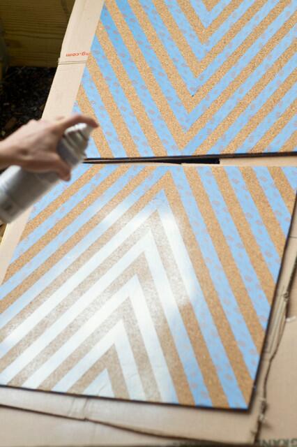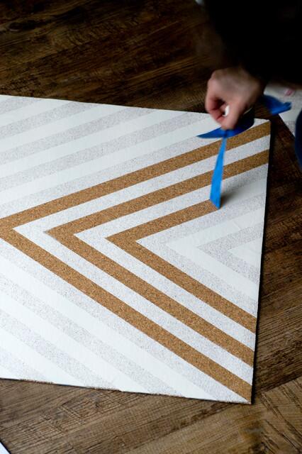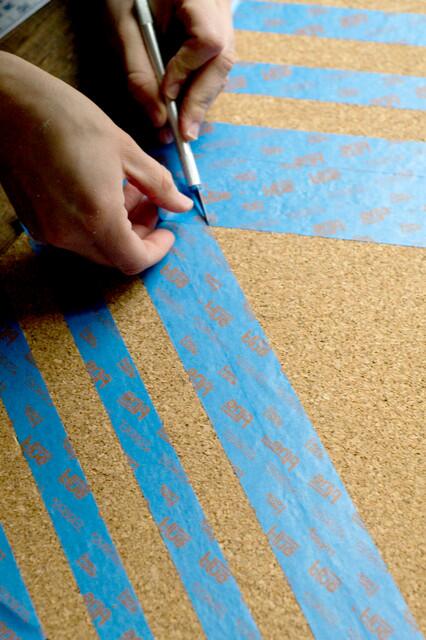 Приклеиваем малярную ленту узором, чем-то напоминающим зигзаг. Этот шаг требуется исключительно в декоративных целях, чтобы немного разнообразить однородную пробковую поверхность. Узор и цвет для такого декора выбирайте, основываясь на собственных проедпочтениях и цветовой гамме комнаты.