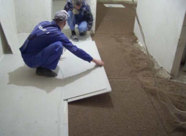 Обратите внимание! Во время работы, которая заключается в засыпке подушки из керамзита, нужно обратить внимание на то, чтобы слой смеси не был тоньше 3 см. Иначе материал ГВЛ после его монтажа будет «плавать» под воздействием ходьбы по полу. Это может губительно влиять на целостность конструкции.