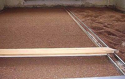 - Существует и другой метод засыпки. Можно сразу засыпать гранулами всю поверхность основания, а затем рейкой выровнять керамзит под будущую сухую стяжку. Передвигаться можно по мостикам из кусков фанеры – так будет легче выполнять работу. Расход сухой стяжки зависит от толщины образуемого слоя.