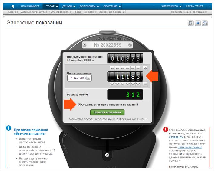 Шаг третий. В графе «Новые показания» необходимо ввести цифры и поставить отметку возле пункта «Создать счет при занесении показаний» и нажать - «Занести показания» .