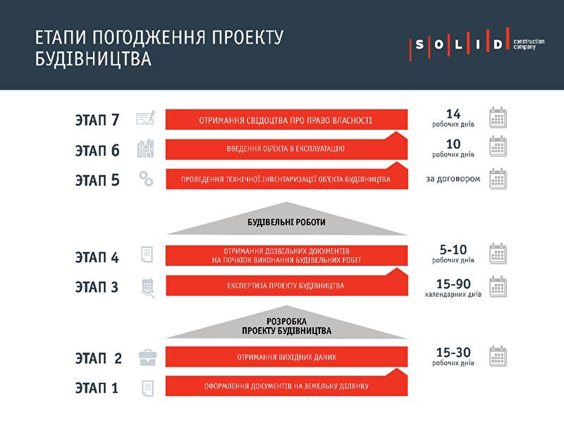 Чтобы начать разработку проекта строительства, заказчик должен пройти два первоочередных этапа: оформление документов на земельный участок и получение исходных данных. Далее цикл согласования проекта, в зависимости от категории сложности объекта строительства, продолжается прохождением экспертизы и получением разрешения на начало выполнения строительных работ (регистрации декларации о начале строительных работ). Когда же здание уже построено, необходимо пройти его инвентаризацию и ввести объект в эксплуатацию. После этого застройщик получает свидетельство о праве собственности. С точки зрения формальных сроков прохождения каждого из этапов, проекты согласовываются достаточно быстро.