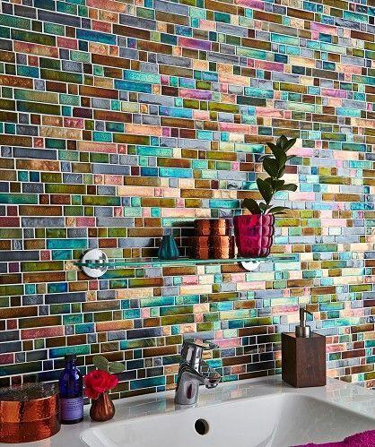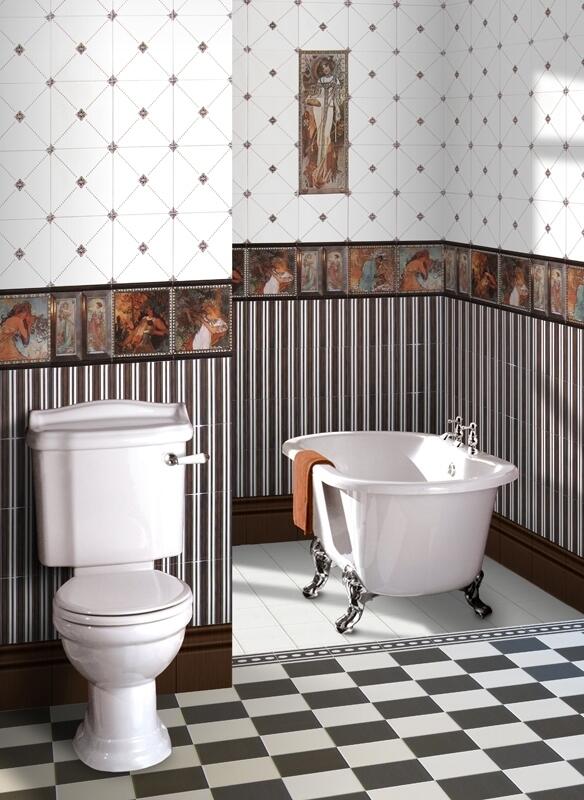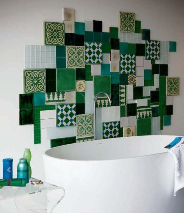 Еще один способ сэкономить на плитке – приобрести несколько поврежденных образцов с большой скидкой и собрать мозаику. Чтобы композицию не портил выступающий клей, не забудьте затереть швы между деталями плитки.