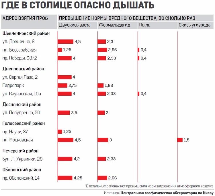 По словам главного санврача столицы Олег Рубана, также опасно дышать загрязненным воздухом людям, болеющих хроническими заболеваниями, так как могут начаться обострения, например, у больных бронхиальной астмой. Превышение в воздухе формальдегида и двуокиси азота чревато отравлениями. Если постоянно дышать воздухом, в котором превышена норма двуокиси азота, то может развиться гипотония или гипертония и сердечно-сосудистые заболевания. Высокая концентрация формальдегида влияет на печень и поджелудочную железу.
