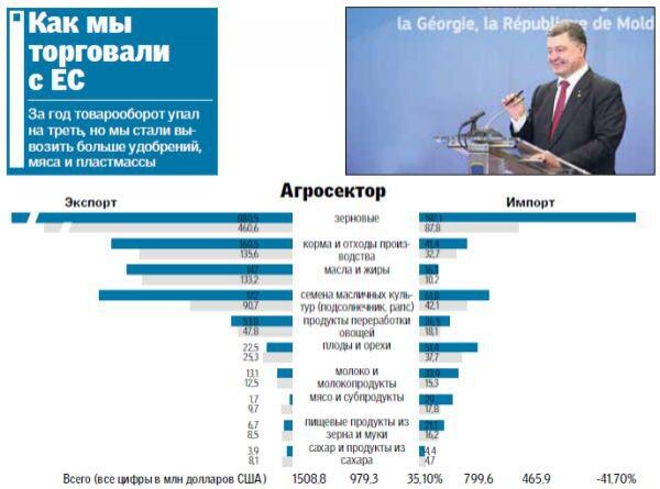 После подписания Украиной экономической части ассоциации с ЕС, от которой ожидалось увеличение экспорта наших товаров примерно на $1 млрд, прошел уже год. Специалисты "Госвнешинформа" по просьбе "Сегодня" выбрали самые важные для потребителя позиции по экспорту и импорту (см. инфографику). И оказалось, что за год (I кв. 2015 г. к I кв. 2014 г.) мы имеем падение товарооборота примерно на треть — хотя по отдельным позициям мы экспорт все-таки нарастили. Так, по мясу экспорт вырос в 5,6 раза, по сахару — вдвое, а по продуктам из зерна и муки — на четверть. А вот импорт практически весь "в минусе": сказались скачки валют и подорожание европейских товаров. Но эксперты говорят, что выгода от евроинтеграции все равно есть.