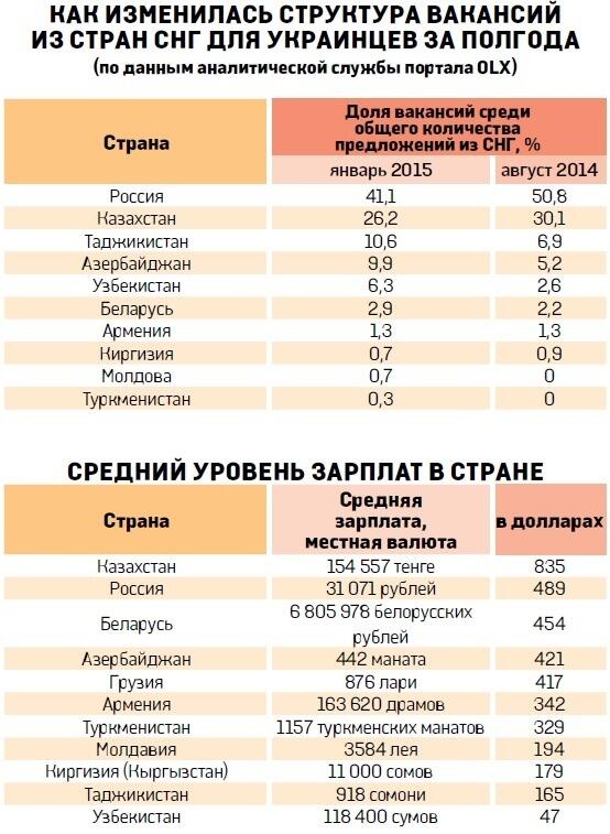 Причем в последнее время украинцы в поисках работы стали ориентироваться не только на страны ЕС, но и на бывшие республики СССР. Да и от них предложения поступают все активнее — их полно на сайтах по трудоустройству, да и в метро попадаются приглашения на работу в Казахстан или Туркменистан. «Число предложений от работодателей из стран СНГ за последние полгода увеличилось на 30%», — отмечают аналитики портала OLX.ua.