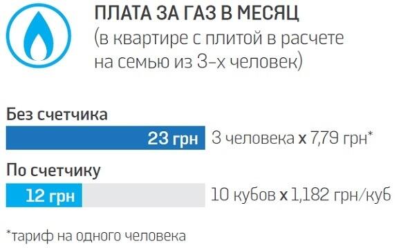 Экономия Специалисты утверждают, что экономия после установки газового счетчика составляет от 10 до 30%. Однако, если не установлен счетчик, а в доме прописано меньше жильцов, чем проживает, то выгоднее оставаться без счетчика. Например, если в квартире прописан один человек, а проживает три, в месяц платеж составит всего 7,79 грн. Та же история, если из газовых приборов, кроме плиты, есть колонка. Если в такой квартире счетчика нет, прописан один человек, а живет минимум два, то чек за услугу будет 23,38 грн. Если же прописаны два человека и более, то счетчик выгоднее: например, за двоих прописанных придется заплатить 46,76 грн, что практически столько же, сколько семья из троих заплатит по счетчику.
