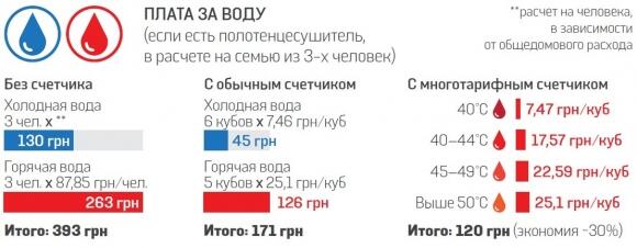 Экономия Даже если человек живет и прописан один, экономия от обычного счетчика очевидна: с ним нужно будет заплатить 97,68 грн в месяц (при среднем расходе 3 куба холодной и 3 куба горячей воды), а без счетчика — 130 грн. В семье из трех человек переплата составит уже 100 грн. «Цена счетчиков — 200–250 грн за один (нужно два), 600–700 грн будет стоить работа, а еще примерно 420–450 грн — дополнительные материалы», — объяснили в фирме Uaclimatе, занимающейся установкой приборов учета воды.