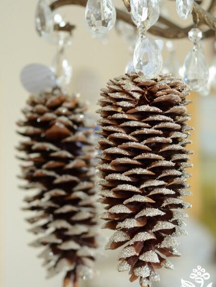 Для данного декора, необходимо заранее запастись хорошими шишками (подойдут любые хвойные), можно применять их для новогоднего украшения в натуральном стиле. Также можно наши шишки обработать краской серебристого цвета. Затем необходимо хорошенько в крутить в каждый плод по шурупу и привязать за него тесьму или ленточку. Кроме этого можно ленты приклеить к шишкам с помощью специального клея. Остается лишь поместить шишки на люстре и радоваться началу долгожданных зимних торжеств.