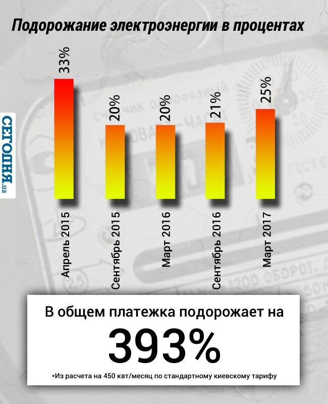 С 1 апреля 2015 года минимальный тариф на электроэнергию для населения увеличился на 19% – до 0,37 грн за кВтч. Этот минимальный тариф применяется к домохозяйствам с объемом потребления до 100 кВтч в месяц .