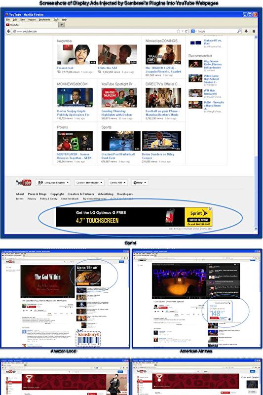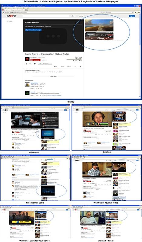 Плагины Sambreel добавляют новые "рекламные места", которые затем продаются через рекламные сети и биржи. Когда слот объявления передается на продажу, YouTube указывается в качестве домена, в то время как три организации Jeetyet Media, Plural Media и Redford Media отображаться как поставщики рекламного места. Эти доменные имена, были зарегистрированы под именем основателя Sambreel Арье Троу, но теперь защищены с пометкой "частный".