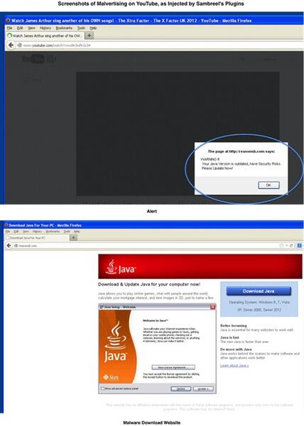 Объявления также скупают распространители вредоносного ПО, при этом используются ложные рекламные сообщения. Например, пользователям сообщают, что им нужно обновить Java. Однако после клика на обновление, открывается поддельный фишинговый сайт и загружается вредоносная программа. Пользователи Youtube обычно не видят такого рода сообщений, так как Google в отличии Sambreel строго следит за контентом рекламных сообщений.