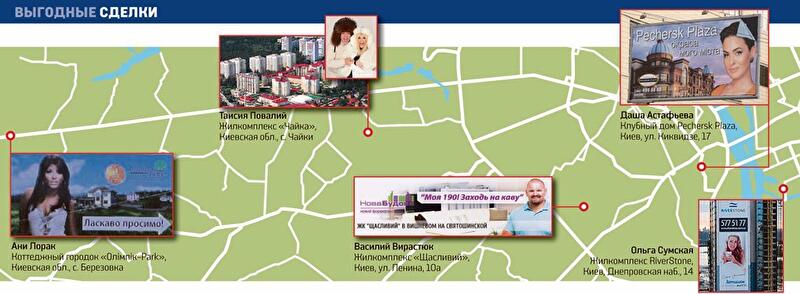 По информации сайтов ВИП-апартаментов, новострой на ул. Киквидзе сейчас «самый дорогой дом в столице». Стоимость трехкомнатной квартиры в 11-этажной высотке по меньшей мере 5,2 млн грн. Именно эти золотые квадраты рекламирует актриса, фотомодель Даша Астафьева. Она отказывается комментировать условия сотрудничества с застройщиком. Однако эксперты говорят: обычно звезда получает либо огромную скидку, либо квартиру в подарок. «В основном знаменитости рекламируют загородные жилкомплексы», — говорит Сергей Костецкий, аналитик SV Development. По его словам, артистка уровня Астафьевой может получить за подобную рекламную акцию несколько десятков тысяч долларов. А если звезда снимется в видеоролике, для наружной рекламы и выступит на корпоративе для жильцов, то вполне возможно, что она получит апартаменты.