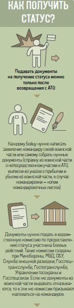 Бойцы признаются: получить статус участников боевых действий очень сложно. «Ребята из нашего батальона подали документы, но пока результата нет. Проблемы возникают на каждом этапе — то воинская часть не хочет давать выписки, пока АТО не закончилась, то кого-то не оказывается в списках. Такое чувство, что власти специально вставляют палки в колеса, чтобы меньше людей получили статус», — рассказал нам Виталий, боец уже расформированного батальона «Шахтерск». Замкомандира полка «Днепр» Вячеслав Печененко говорит, что никто из его бойцов также еще не смог получить статус. «Уже прошли три недели с тех пор, как мы подали документы в ведомственную комиссию МВД, но результата нет. То есть, когда мы дойдем до межведомственной комиссии, вообще непонятно. Зато есть куча проблем. Например, по документам, место дислокации батальона — Бердянск, хотя на самом деле мы были в Мариуполе и Песках. Были проблемы с тем, чтобы обозначить документально наше настоящее местоположение», — говорит Печененко. Комбат «Айдара» Сергей Мельничук тоже жалуется на проблемы с получением статуса. «У нас в батальоне есть люди, уже его получившие, но их единицы. Большинство же подали документы и ждут ответа. Знаю, что много проблем возникает у раненых и контуженых с получением инвалидности. Там же количество льгот зависит от группы, а нужную группу доказать сложно — ребята ходят по медкомиссиям, и их очень много», — сказал нам Мельничук.