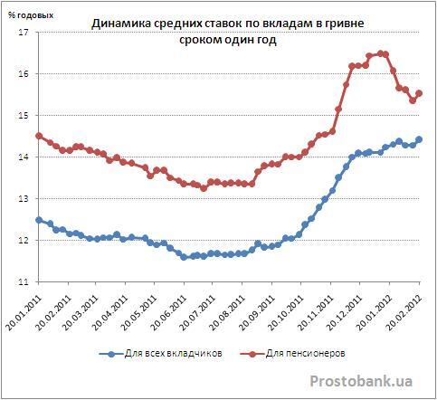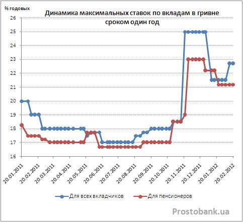 Несмотря на то, что средние ставки по вкладам для пенсионеров традиционно превышают среднюю доходность остальных депозитов, с максимальными ставками наблюдается радикально противоположная ситуация. По исследованиям компании «Простобанк Консалтинг» на 20 февраля 2012 г., максимальная ставка по депозитам сроком на год у банков из числа 50-ти лидеров по активам достигает 22,7% годовых в гривне, а пенсионерам предлагают не более 21% годовых.