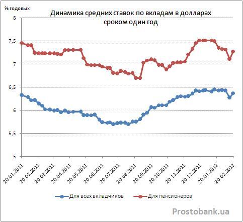Средние ставки по вкладам для пенсионеров по исследованиям компании «Простобанк Консалтинг» выше, чем по депозитам для остальных категорий вкладчиков: в течение всего 2011 года разница сохранялась на уровне 1,7-2 процентных пункта в гривне и 0,8-1,2 процентного пункта в долларах.